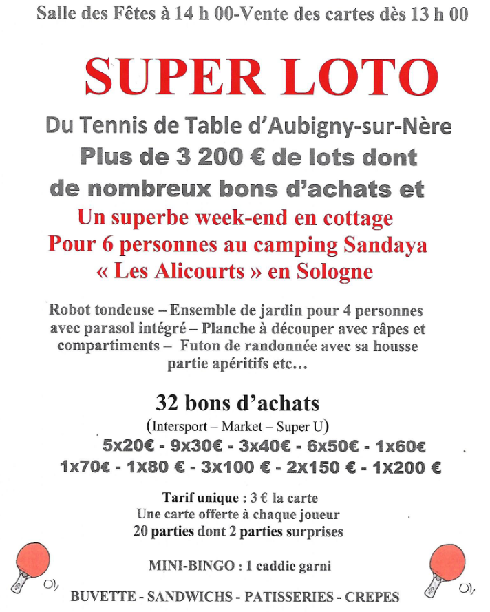 Pour celles ou ceux qui sont disponibles, venez aider les membres du Comité directeur à installer la salle des fêtes ; rendez-vous à 10h au club house. Vous pouvez également confectionner des gâteaux qui seront vendus lors du Loto. Et, bien sûr, venez jouer!